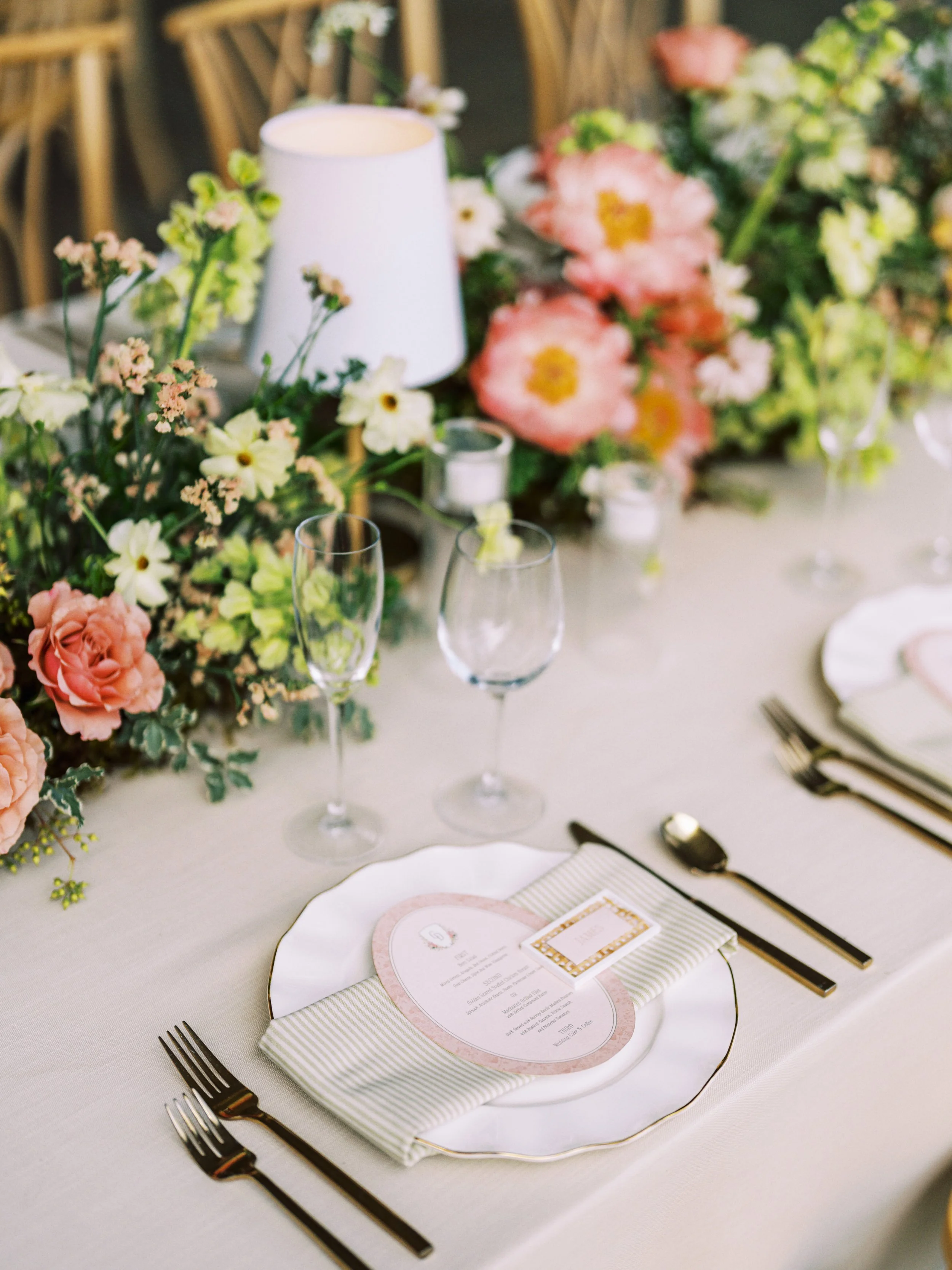 The reception was equally stunning, with tables draped in pink, green and white linens and decorated with exquisite floral centerpieces. The joyous celebration continued with delicious food, heartfelt toasts, and plenty of dancing. For a closer look at their beautiful wedding, check out the photos below and the amazing team of vendors who made this event possible.