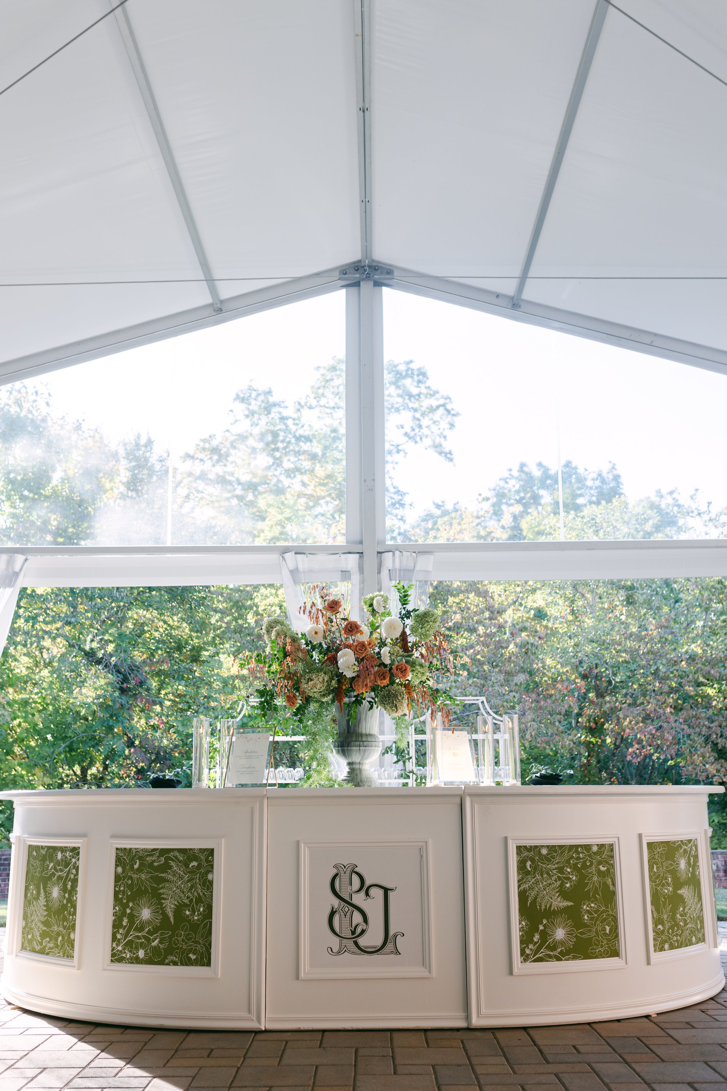 Sydney and Jake's wedding was a stunning celebration of love, infused with shades of olive green and personalized monograms. We had a lot of fun with this design, breaking from the traditional round tables and utilizing square tables adorned with patterned linens to set the stage for a unique fall palette of warm greens, whites, and gold accents.